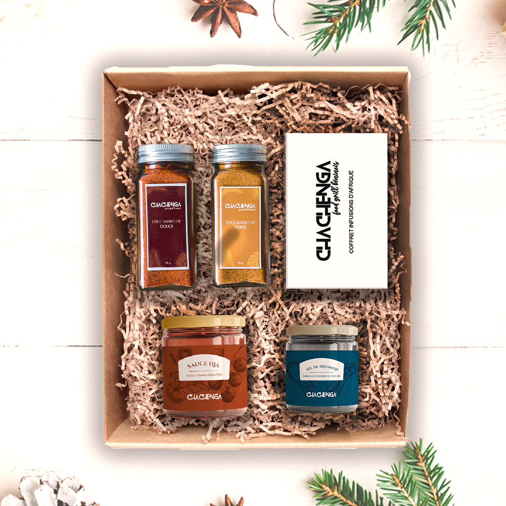 Assortiment de 2 épices chachenga épice douce et épice forte – 1 sel de djègbadji – 1 sauce dja – Un mini coffret dégustation de thé au saveur ancestrale – 1 feuillet avec des conseils et une recette dont : Shakshuka au oeufs et poivron.